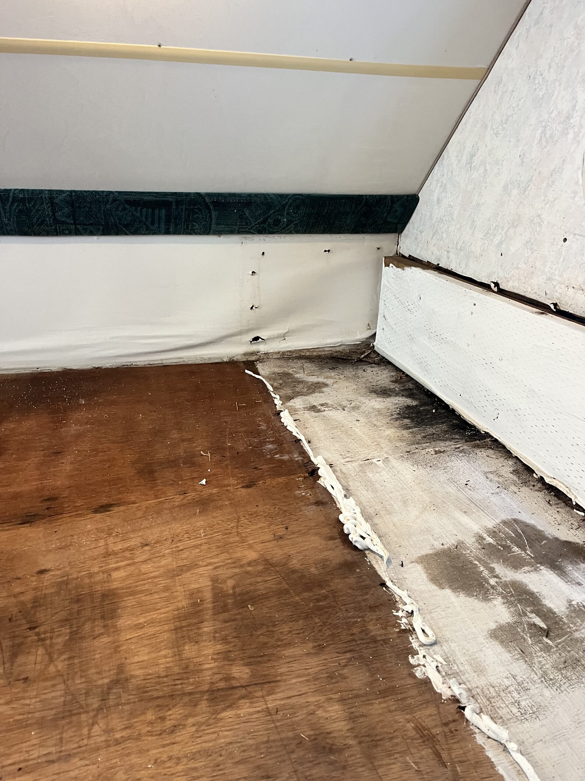 When our new bed arrived from Amazon, we removed the old one and discovered that the previous owner had simply laid fresh plywood over a moldy base. My heart sank. Then we opened the closet and saw black mold in our camper creeping up the walls. Just like that, the high we were riding was over.